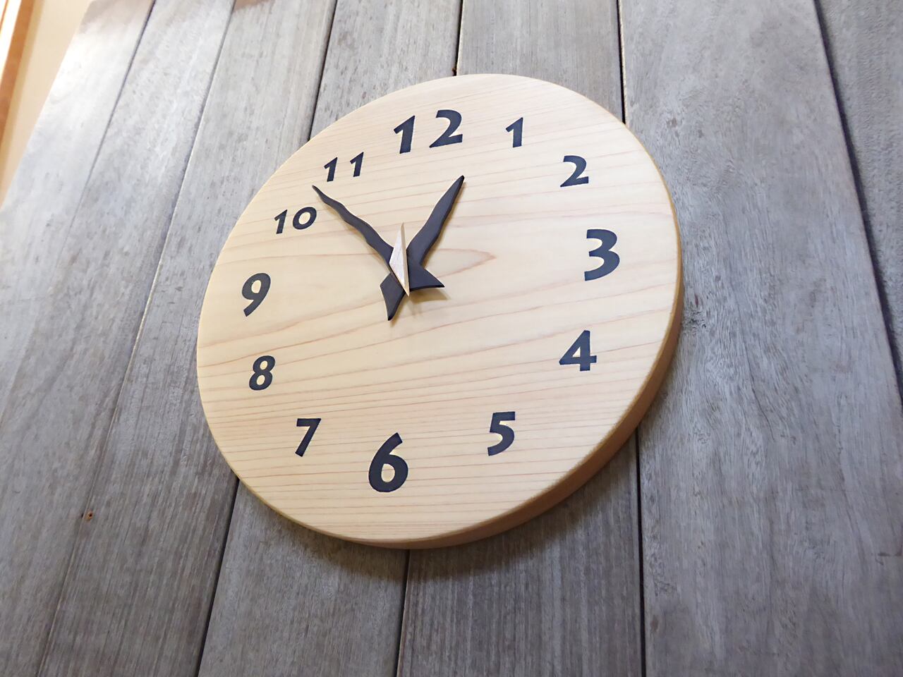 静岡県産のヒノキ材を使った木の時計です。径26センチ。